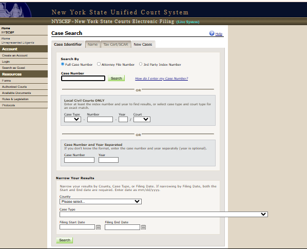 - Performing a nyscef case search using index number or party name