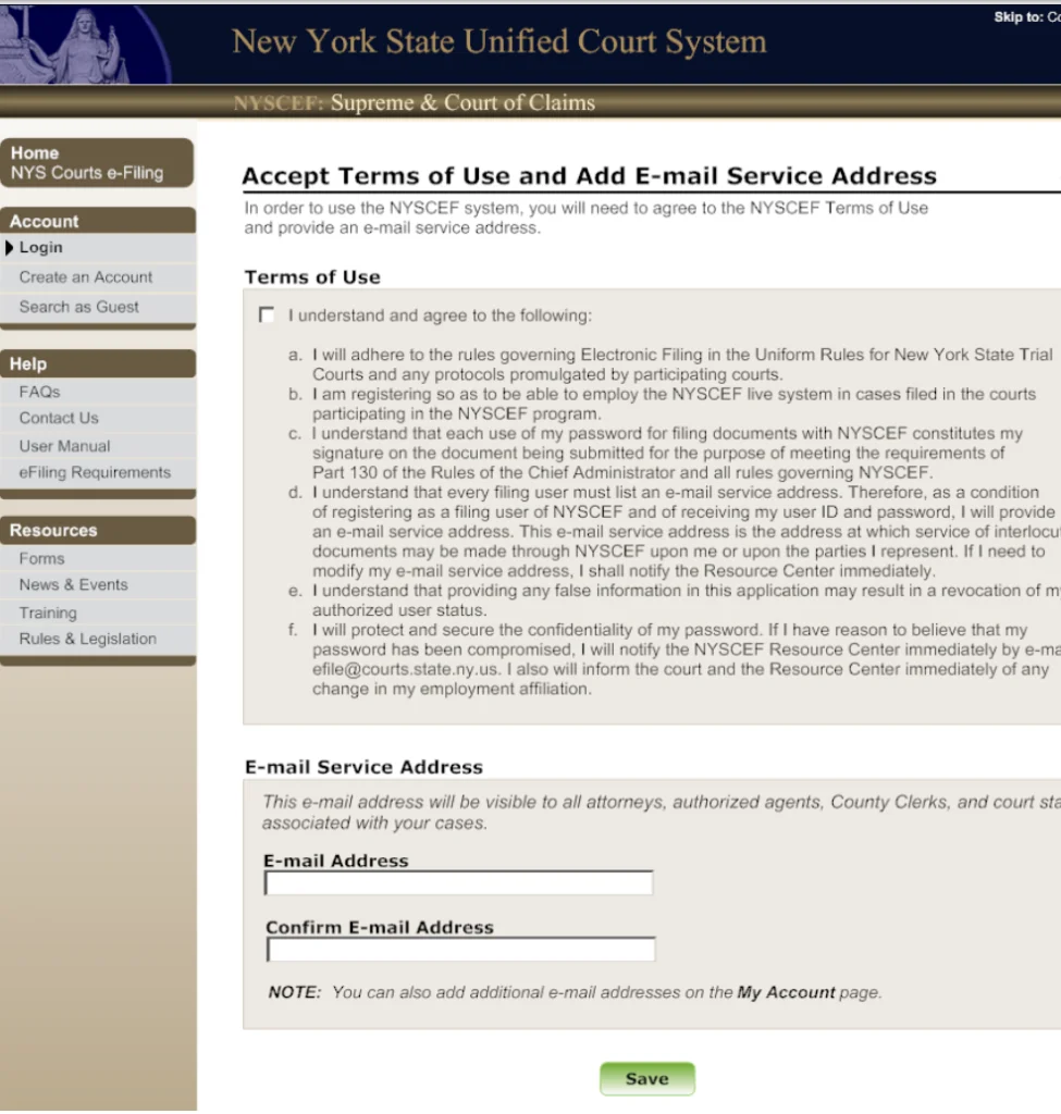 On first login, users must accept the NYSCEF Terms of Use and enter a primary email address for service of documents. This step is required only once.