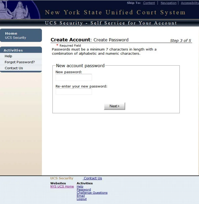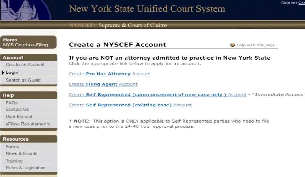 Users who want to access the NYSCEF system must click the “Create NYSCEF Account” link. This directs them to the appropriate account creation page based on their role.