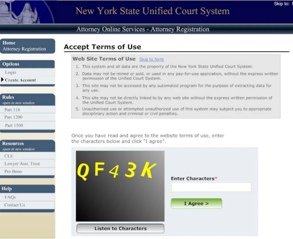 Users begin by entering the characters displayed on the screen and agreeing to the Attorney Online Services (AOS) Terms of Use. This page appears only once during account creation and confirms that users acknowledge the system rules.