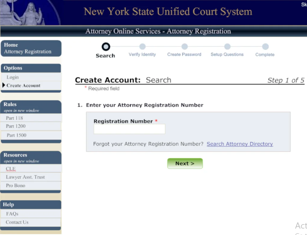 Attorneys must input their Attorney Registration Number. If unsure, they can click “Search Attorney Directory”, which opens in a new window to locate their registration number.